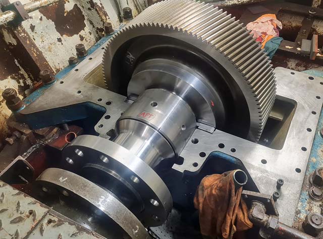 The reduction gear from Volda was delivered in 1968. The ferry company considered whether to repair the old unit, and when the unt was dismantled it turned out that refurbishment would be feasible. General wear was as might be expected after 55 years, and the gear oil cooler had at one-point leaked salt water into the gearbox, which had caused damage to the white metal bearings. As Brunvoll owns all necessary drawings as well as the expertise, machines and tools to produce most of the larger parts directly from the factory in Volda, new parts could be made as necessary. A gearwheel which should be firmly shrunk onto the shaft was loose, so a new shaft was made. All white metal bearings in the gearbox were replaced due to wear and saltwater intrusion. Brunvoll has its own white metal production so updated versions of the bearings were made with new lubrication grooves and bearing clearances. The original pump from 1968 was checked and found in good condition, while original clutch hub was cleaned and restored for further operation.