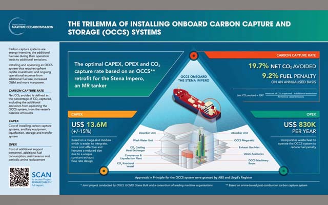 Project Remarccable (Realising Maritime Carbon Capture to demonstrate the Ability to Lower Emissions) of which GCMD plays a leading role, alongside partners including ABS, Alfa Laval, Deltamarin, Lloyd’s Register, Seatrium and TNO, has concluded that the adoption of OCCS faces significant challenges, requiring optimising around its ‘trilemma’ for adoption: