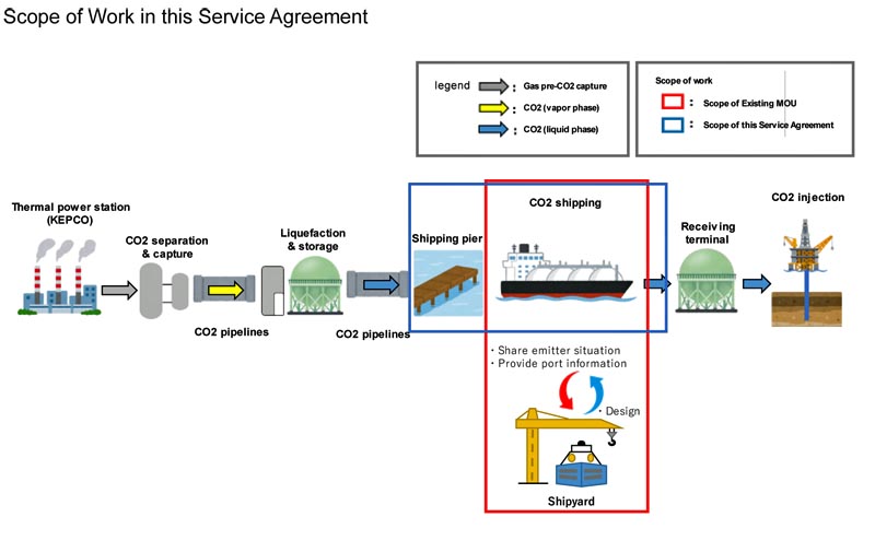 Based on this Service Agreement, ‘K’ Line and KEPCO will study and develop optimal specifications for liquefied CO2 carriers and aim to realise liquefied CO2 marine transportation.