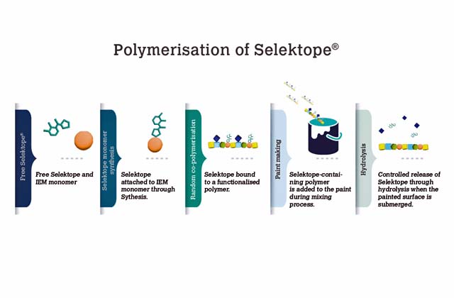 To test the concept, coating formulations containing Selektope introduced in the traditional way via interactions with metal pigment versus Selektope introduced via attachment to a co-polymer chain were tested alongside a control coating containing no biocidal components in static field tests off the west coast of Sweden. After 10 months, the control panel displayed heavy barnacle fouling whereas the panels coated with paints containing Selektope, both introduced via the traditional method and via the new method of attachment to a co-polymer chain, were barnacle-free. This provided proof of concept that attaching Selektope to a co-polymer for use in SPC antifouling coatings is possible.