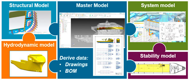 When we combine integration, automation and intelligent design exploration with full scale vessel simulation under realistic operating conditions we have the virtual digital framework in place to perform Simulation Driven Ship Design (SDSD), which will, with time in the author’s opinion, completely replace the ‘design spiral’ as we know it. A simplified graphical representation of the SDSD concept is shown in Figure 3. At the centre we have the ‘single source of truth’ – a ship Master Model that can contain any or all the information about any aspect of vessel performance or design needed, from General Arrangement, to Structural Design, to Marine Systems and so on.
