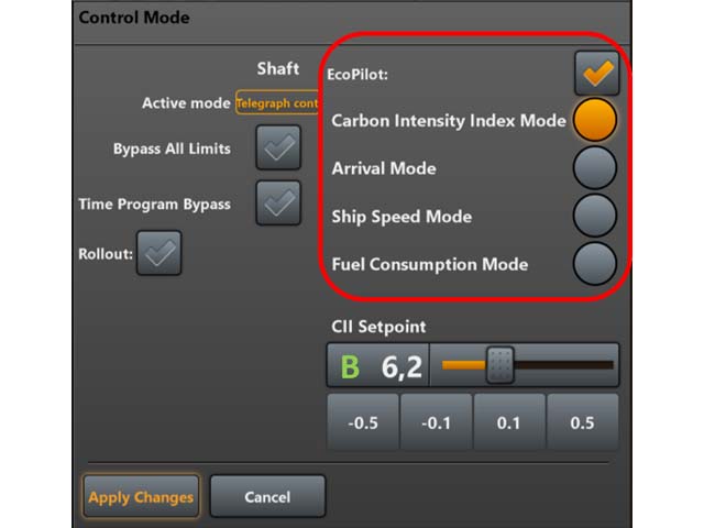 EcoPilot has been in operation for more than 10 years. It has different operational modes: arrival time, fixed ship speed, lowest fuel consumption or desired CII value. The CII mode is the latest addition, developed in response to IMO regulations.