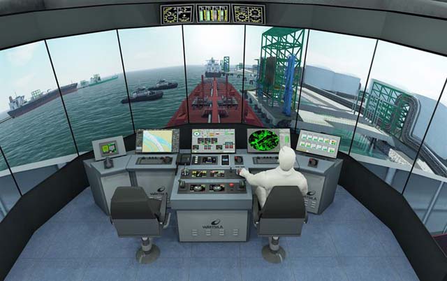 The Wärtsilä equipment includes a full-sized class A navigational bridge simulator using nine portrait-mounted and one landscape-mounted rear view 75in displays, giving a 240 degree horizontal view and good vertical height. Furthermore, there will be a virtual reality bridge and bridge wing, a tug simulator, and an engine room simulator including a virtual machinery space.